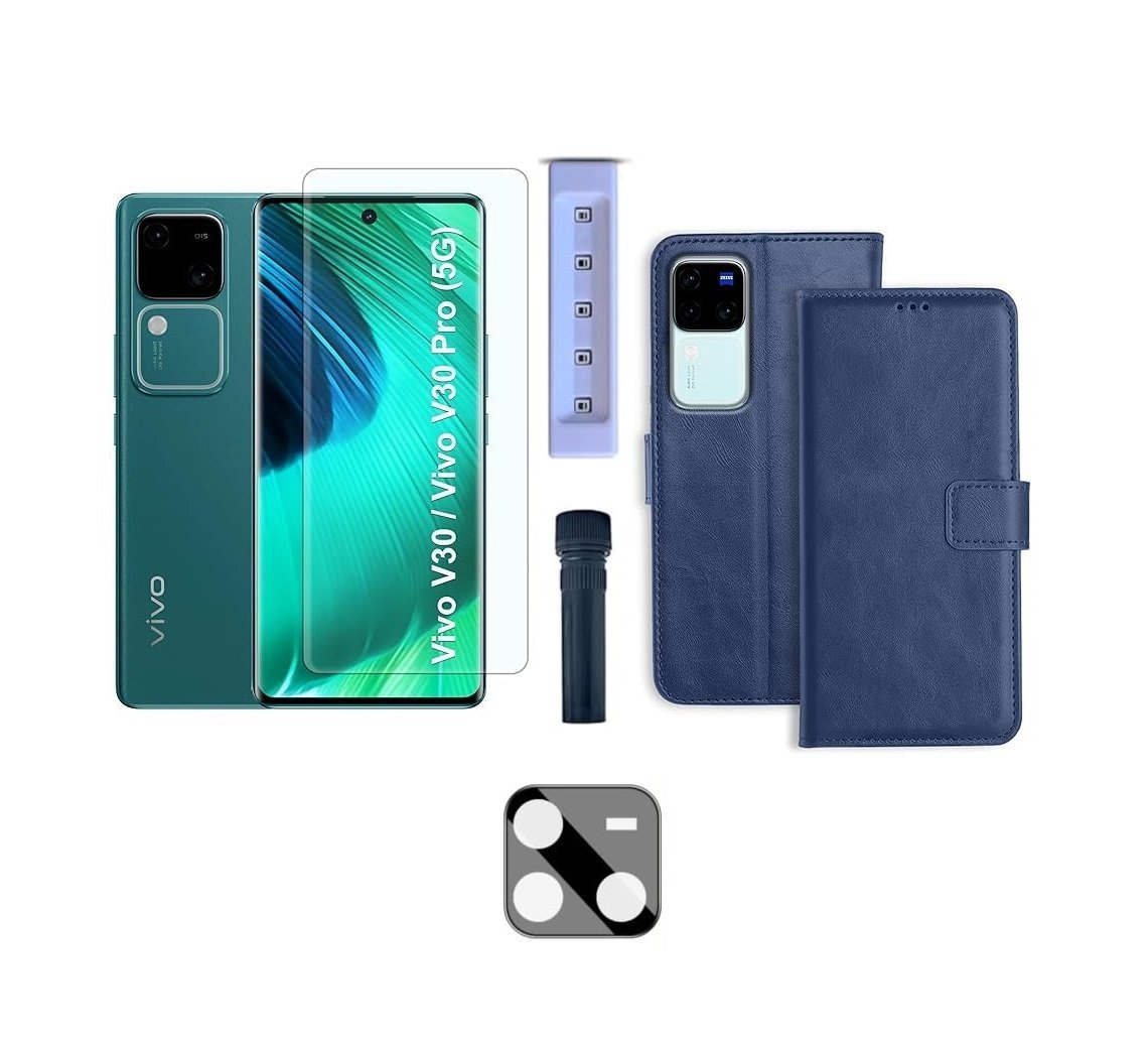 The 3-in-1 Combo Pack for the Vivo V30/Vivo V30 Pro 5G – Flip Blue centers its features around full-body protection, aesthetic appeal, and added utility, primarily through the flip case design.