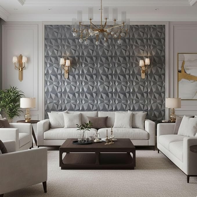 Dynamic Lighting: The faceted diamond surfaces are specifically designed to catch light from different angles, making the wall “shift” as you move through the room.