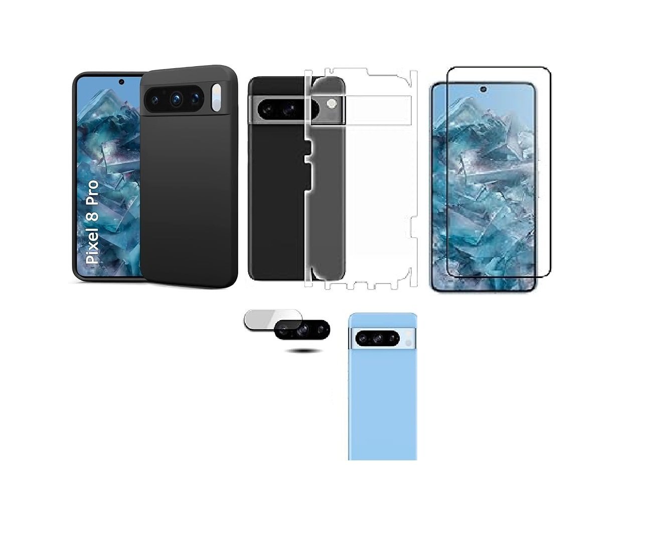 4 in 1 Combo Pack for Google Pixel 8 Pro – Black (Back Cover + Camera Lens Protector + Tempered Glass + Unbreakable Film)