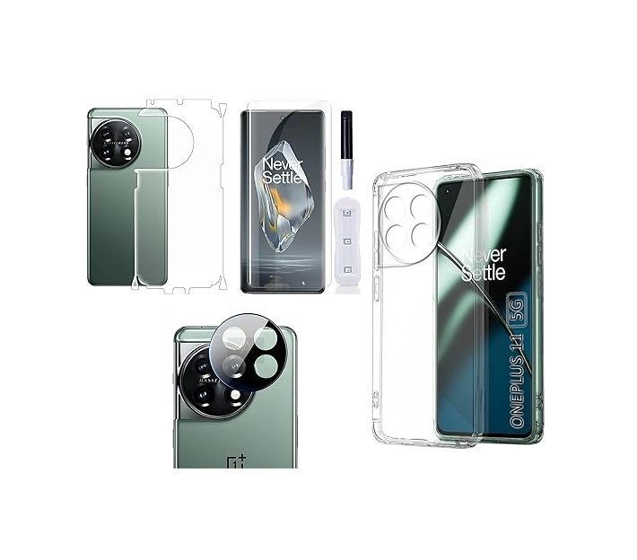 4 in 1 Combo Pack for OnePlus 11 5G –Transparent (Back Cover + Camera Lens Protector + Tempered Glass + Unbreakable Film)