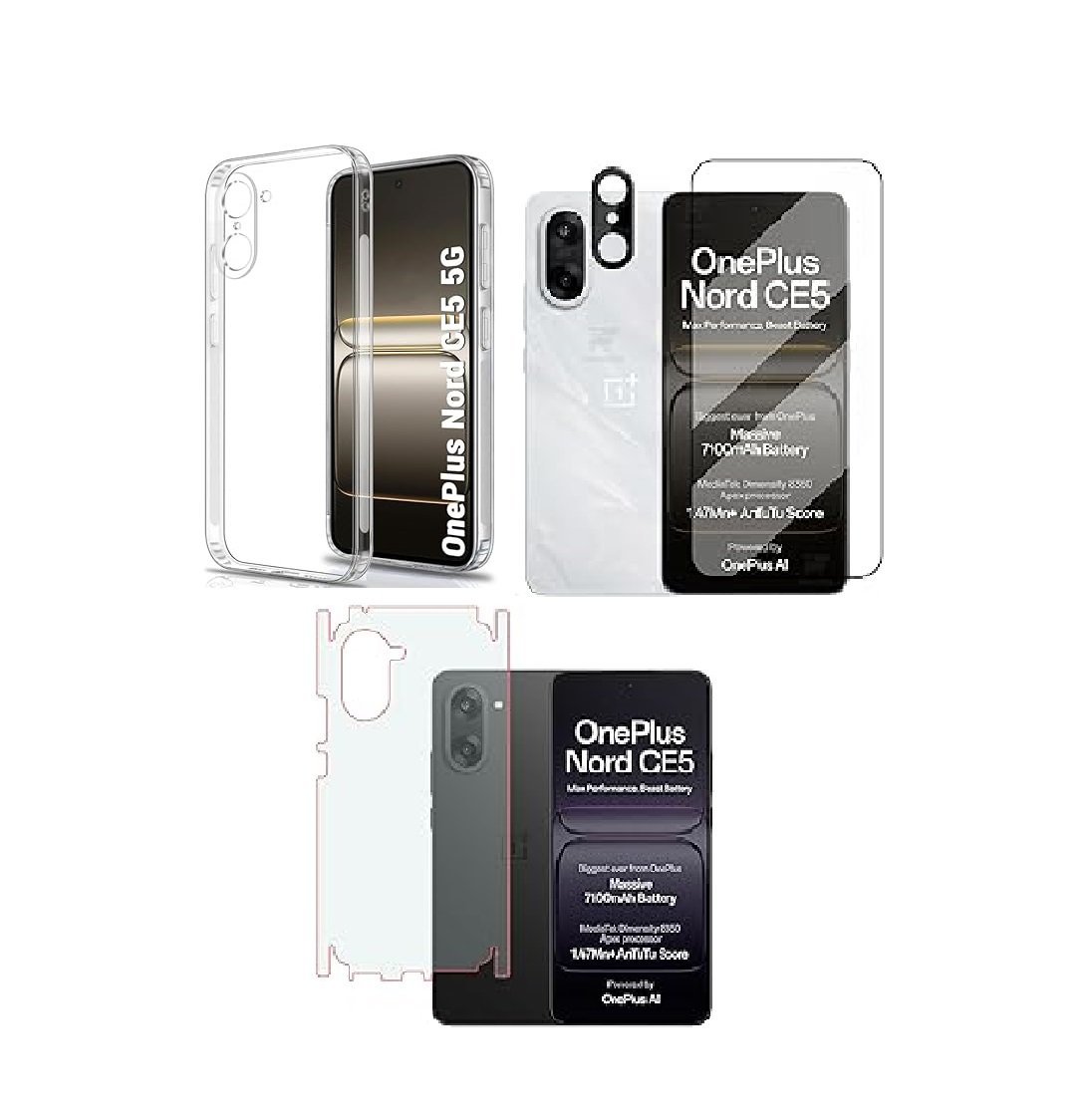 4 in 1 Combo Pack for OnePlus Nord CE 5 5G –Transparent (Back Cover + Camera Lens Protector + Tempered Glass + Unbreakable Film)