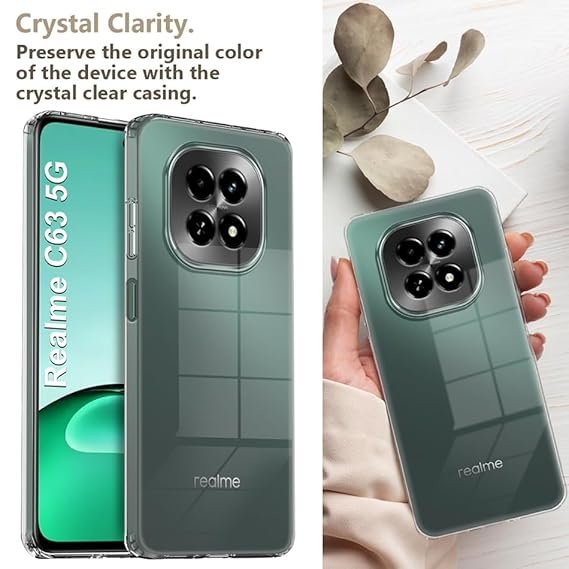 - Design: Crystal Clear – Designed to be fully transparent, allowing the original colour and design of the Realme C63 5G (e.g., Starry Gold, Forest Green) to show through.