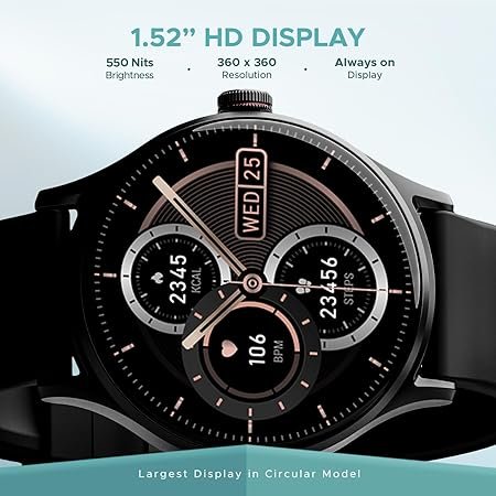 boAt Lunar Vista w/Large 1.52″ (3.8 cm) HD Always on Display,550 Nits Brightness, Functional Crown,100+ Sports Mode, Fitness Smart Watch for Men & Women (Black)