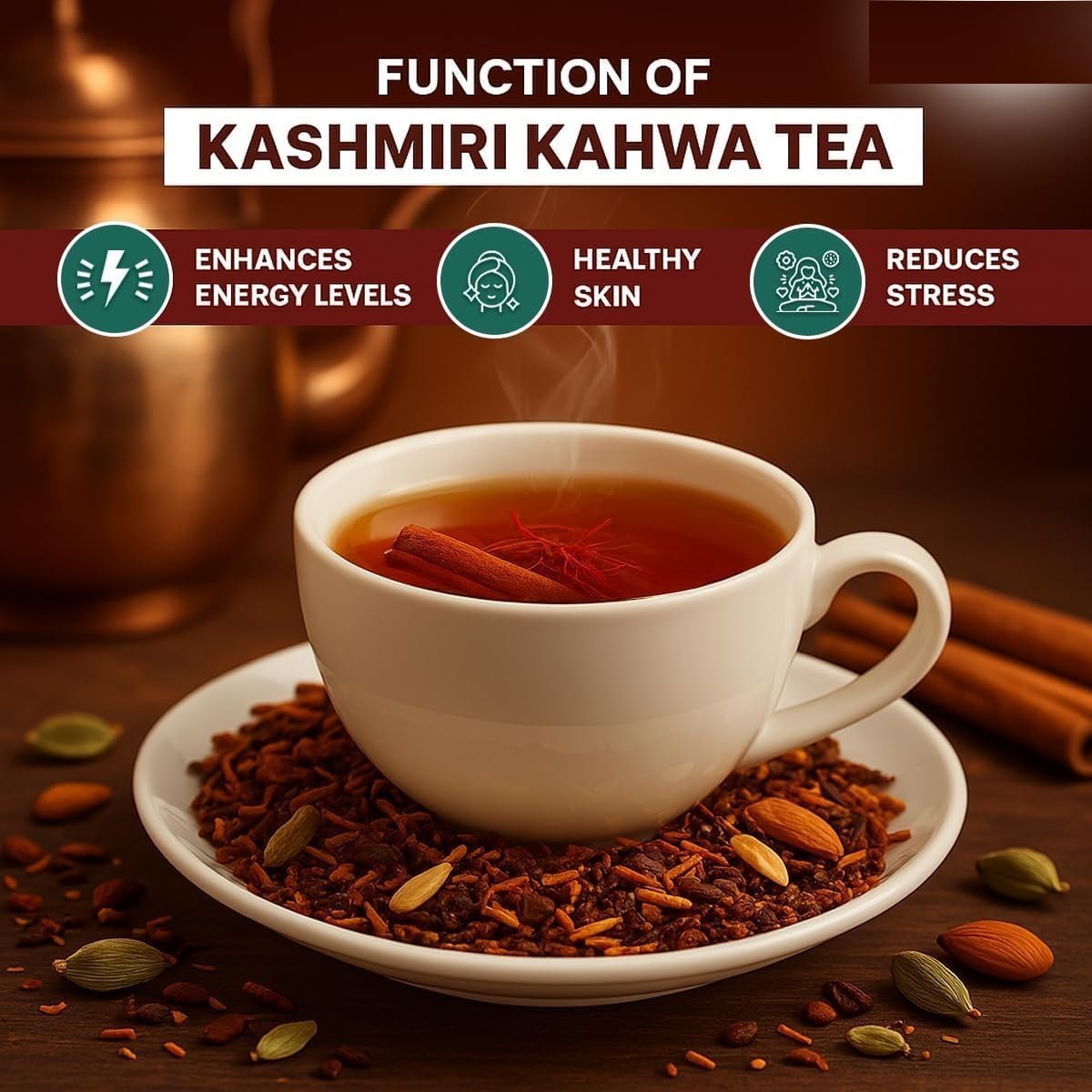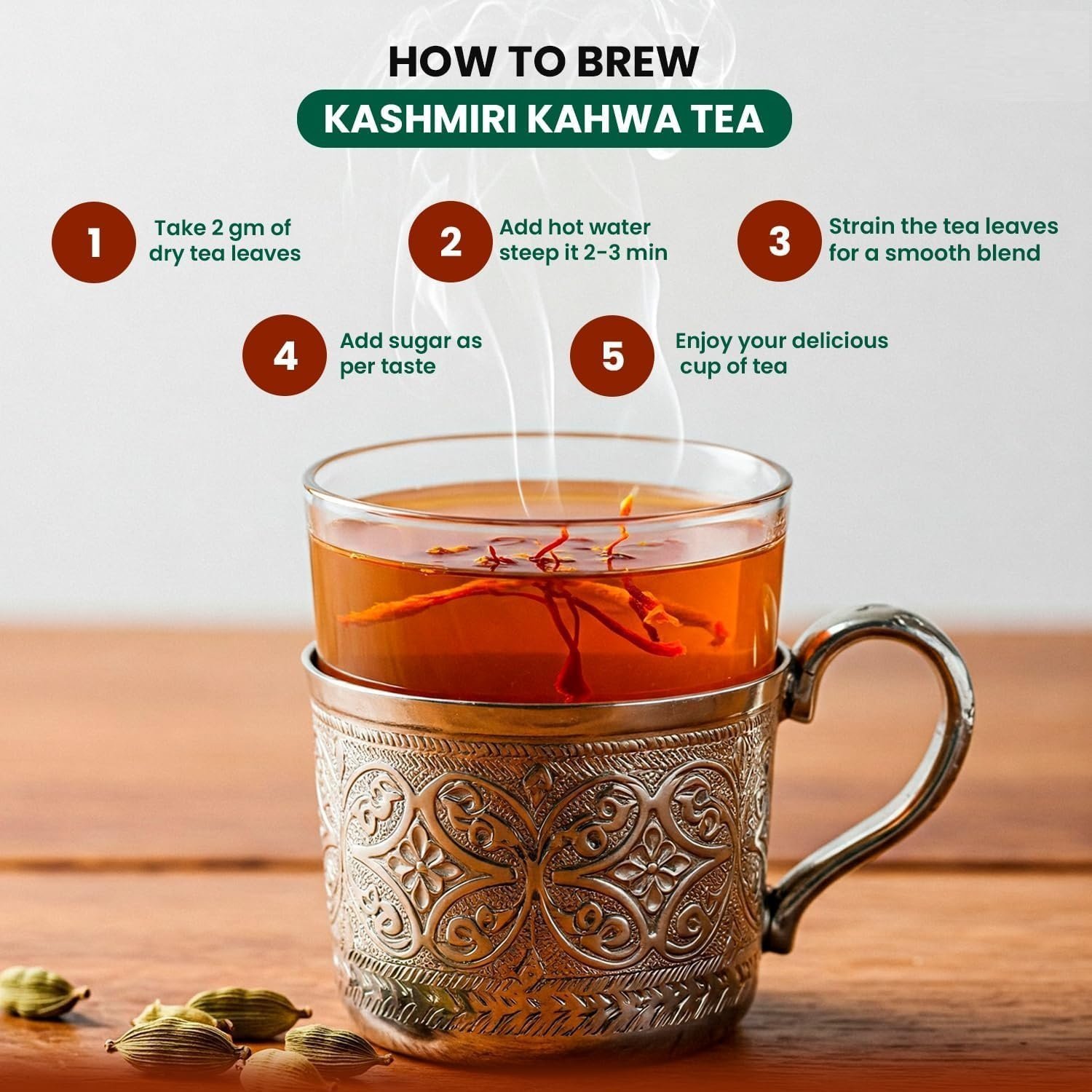 - Premium Kashmiri Blend – Crafted with green tea, saffron, cardamom, cinnamon, and rose petals for a rich and aromatic experience.