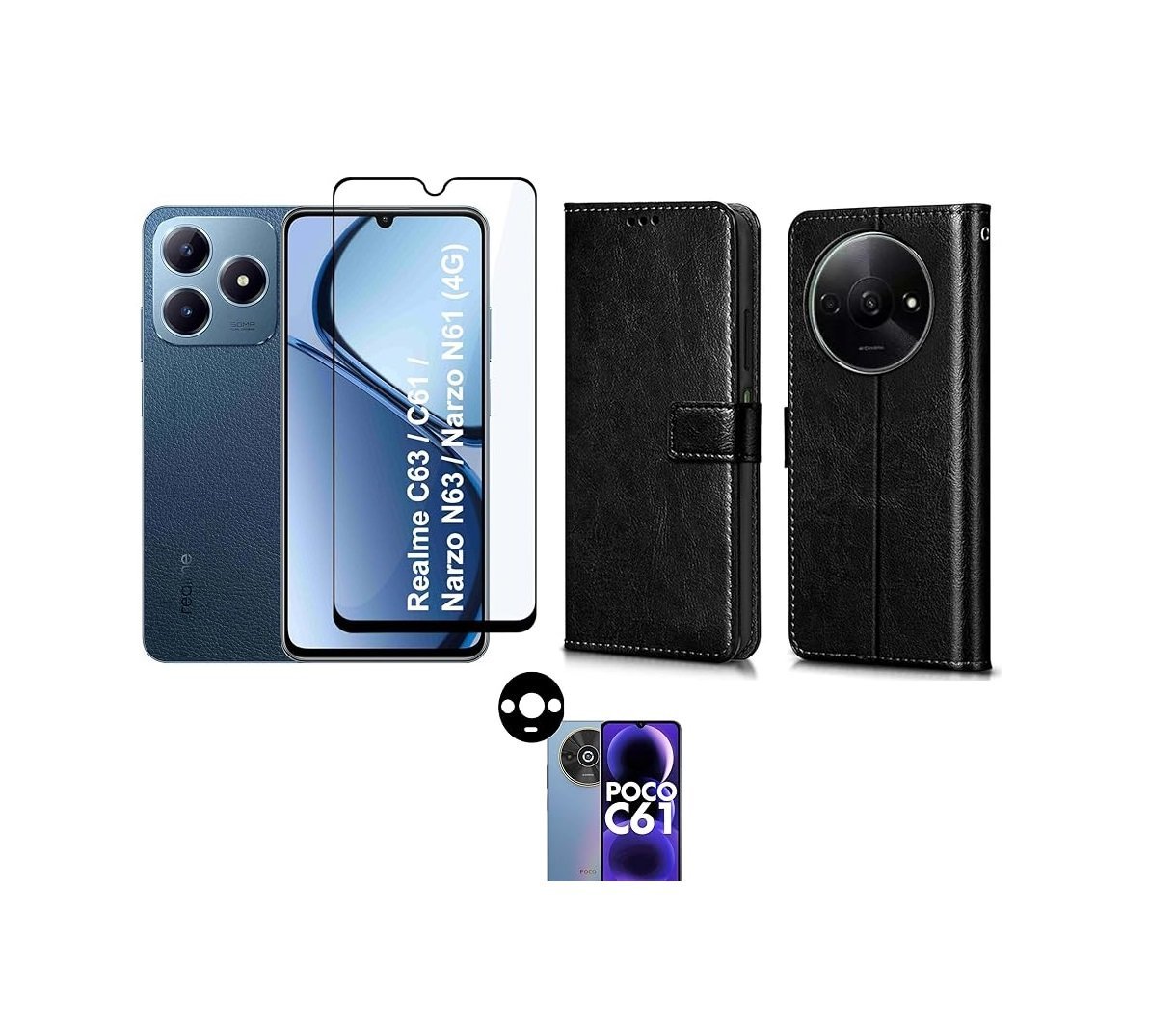 Premium 3-in-1 protection combo for Poco C61 5G. This pack features a Black Leather Finish Flip Case with magnetic stand, card holder, and shockproof design for secure everyday use. The HD Tempered Glass safeguards the screen from scratches, drops, and smudges, while the Camera Lens Protector keeps the camera lens safe and scratch-free for clear, high-quality photos. Ideal combo for full-body protection with style, functionality, and durability.