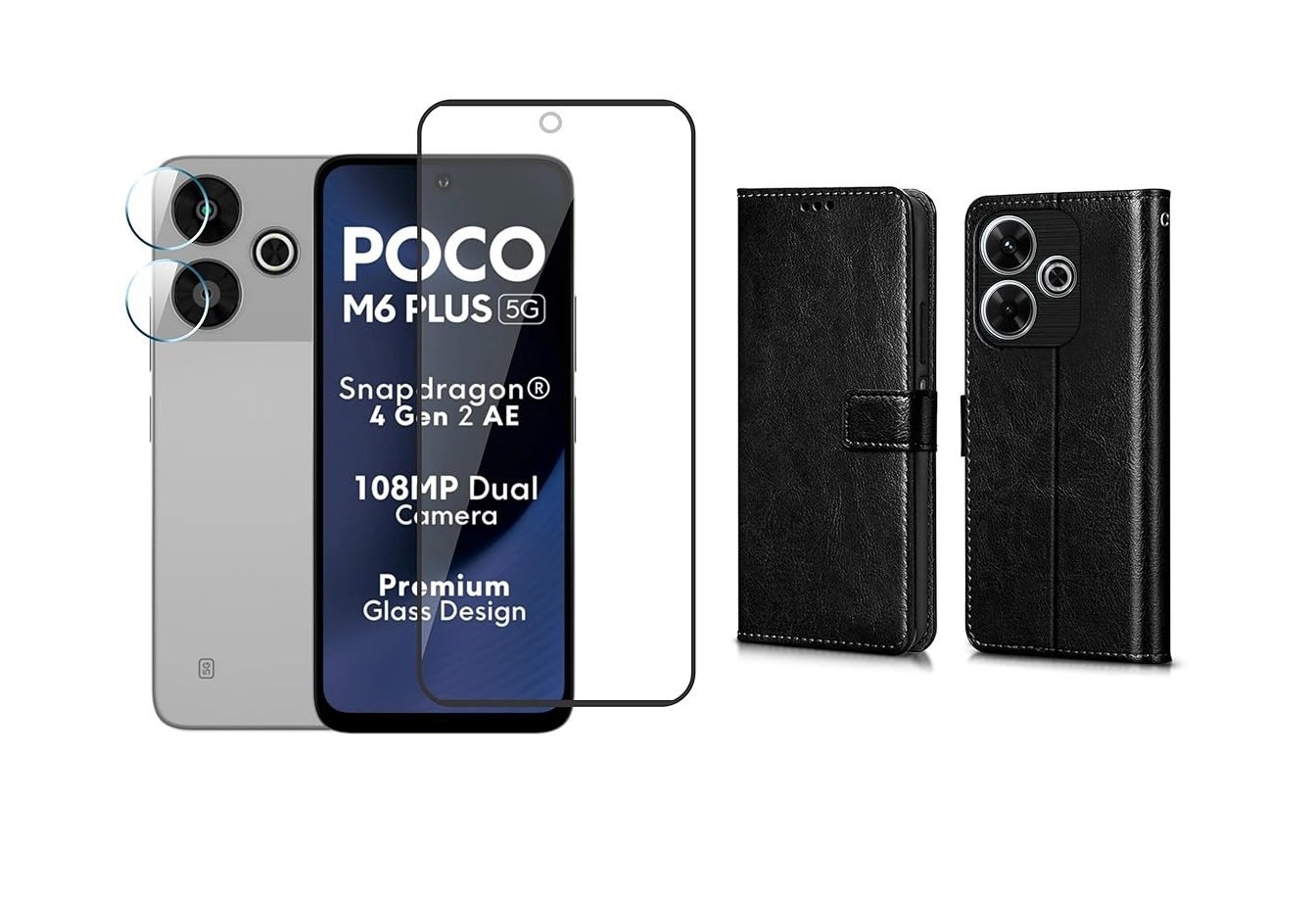 Redmi 13 5G / Poco M6 Plus 5G Flip Cover (Black) – Leather Finish | Tempered Glass + Camera Lens Protector Combo Pack