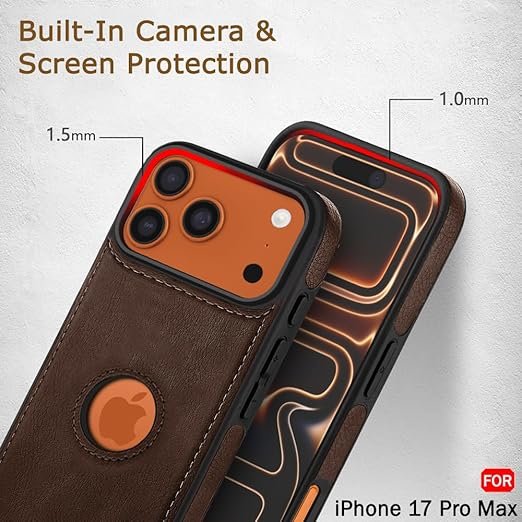 The Genuine Leather Finish Back Cover Case for iPhone 17 Pro Max in Brown is a premium “minimalist-luxe” accessory designed for Apple’s 2025 flagship. Given the iPhone 17 Pro Max’s redesigned horizontal “Camera Plateau” and its slightly larger 6.9-inch profile, this case focuses on adding structural grip and executive style to a massive device.