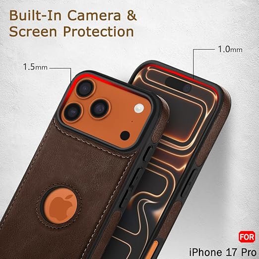 The Genuine Leather Finish Back Cover Case for the iPhone 17 Pro (Brown) is a professional-grade accessory designed for Apple’s 2025 flagship. It is specifically engineered to accommodate the iPhone 17 Pro’s major design departure: the horizontal “Camera Plateau” and its new 8.8mm aluminum/glass unibody.