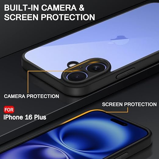 The Ultra-Hybrid Shockproof Sleek Armor Back Cover for the iPhone 16 Plus (with Black Sides) is a premium “two-tone” protective case. It is designed to solve the common issue of clear cases turning yellow over time by using a solid black frame while keeping the back panel completely transparent.