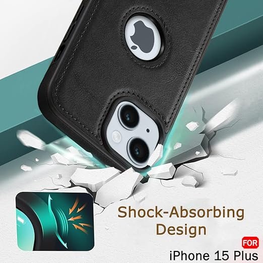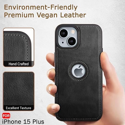 The Genuine Leather Finish Back Cover Case for the iPhone 15 Plus in Black is designed for those who appreciate a classic, executive aesthetic paired with reliable modern protection.