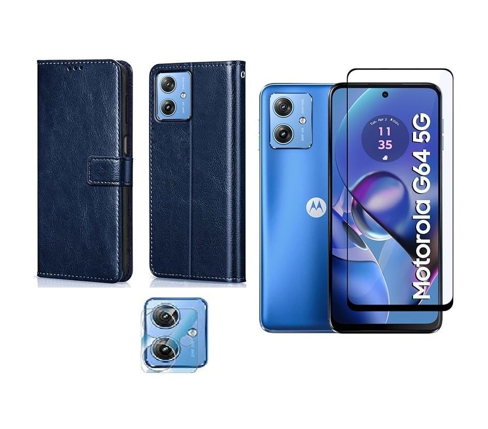 The Flip Blue designation means the primary protective item is a Folio or Wallet Case in blue, designed to fit both the Motorola Moto G54 5G and Moto G64 5G perfectly, as their dimensions and camera placements are nearly identical.