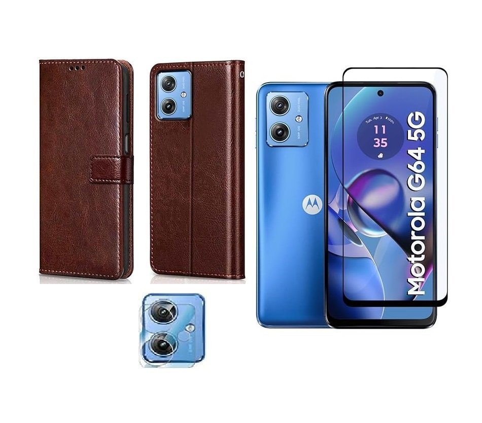 The Flip Brown designation means the main protective item is a Folio or Wallet Case in a rich brown color, designed for both the Motorola Moto G54 5G and Moto G64 5G due to their shared dimensions and camera module size.