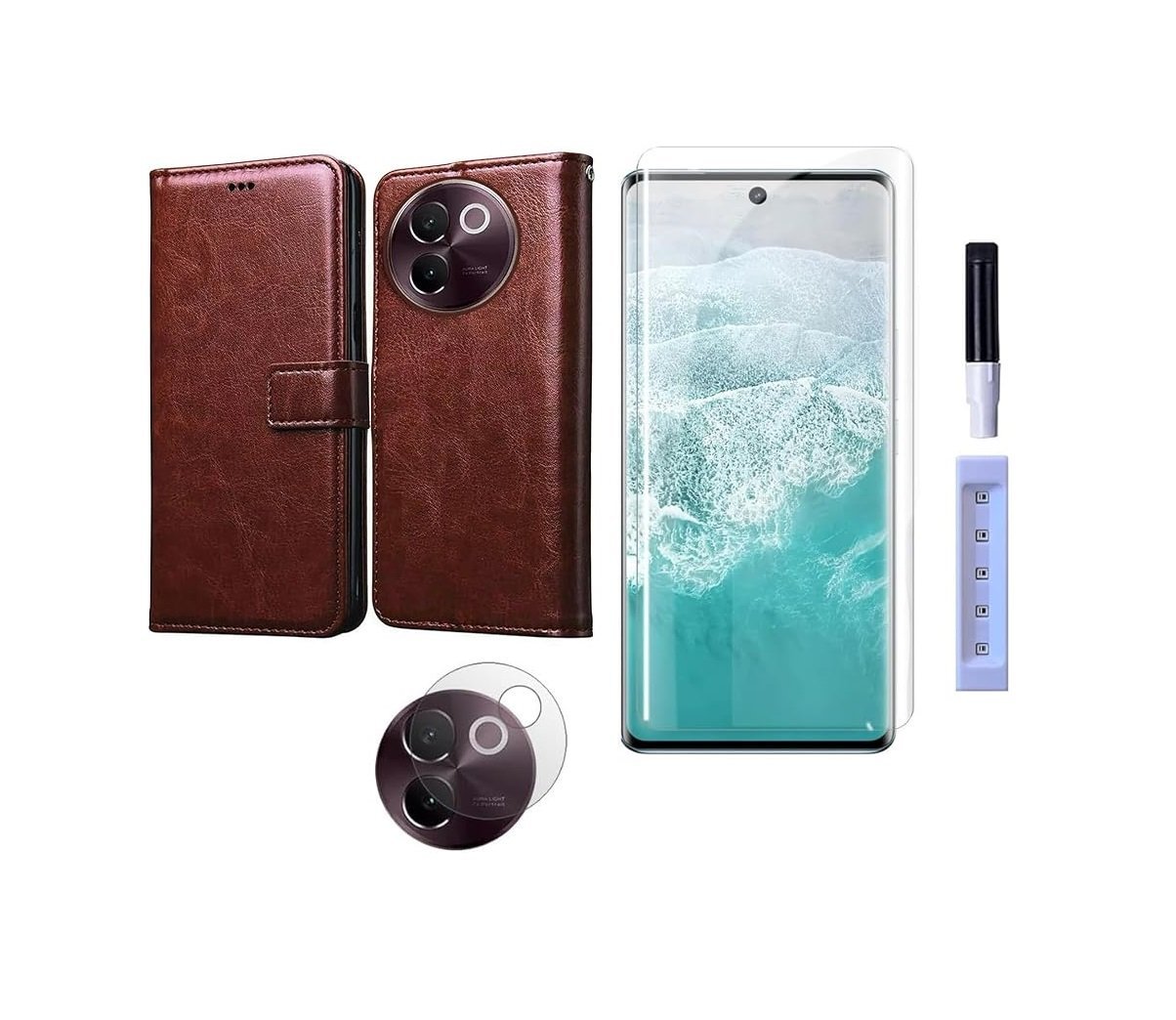 The 3-in-1 Combo Pack for the Vivo V30e 5G – Flip Brown Cover is a comprehensive protection solution defined by its professional, wallet-style design and added utility features.