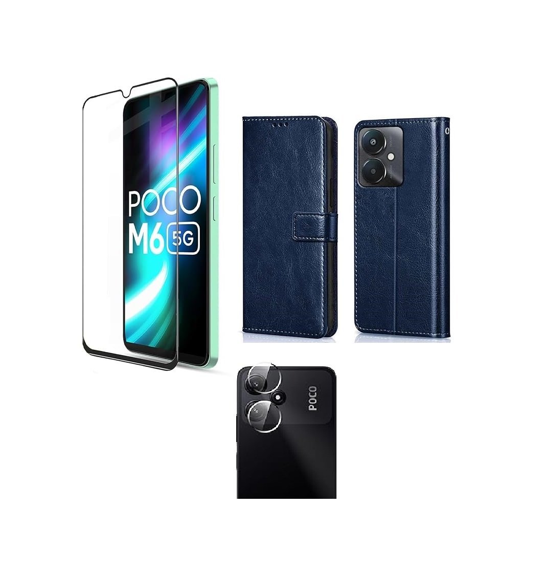 3 in 1 Combo Pack for Mi Redmi 13C 5G | Redmi 13C 4G | Poco M6 5G | Poco C65 – Flip Blue (Back Cover + Camera Lens Protector + Tempered Glass)