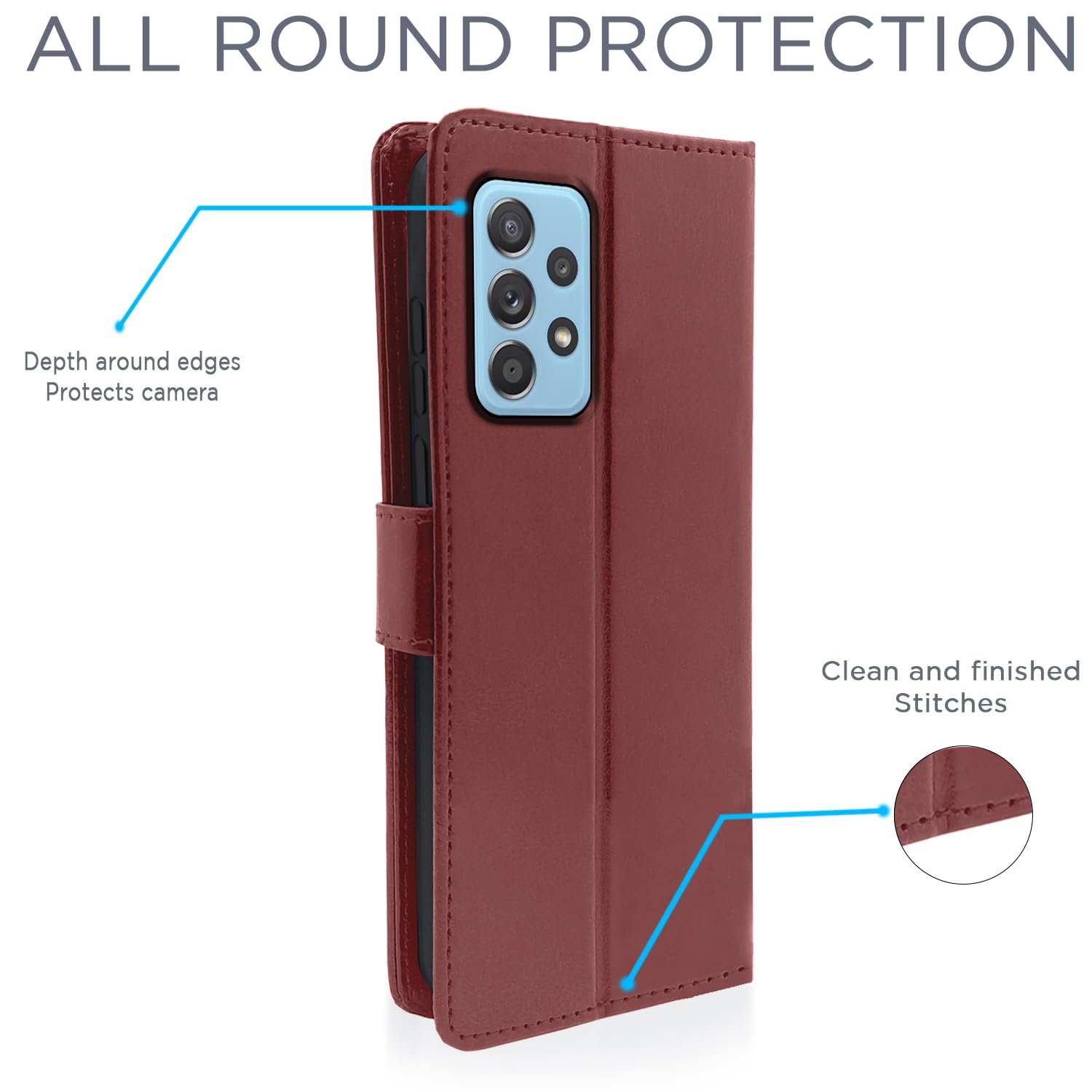 Invest in your brand new Samsung Galaxy A52 device’s protection today through this fit to use executive brown leather stand wallet case flip cover and save yourself from the heartbreak and agony of watching the scratches and damages on your device multiply periodically. This sleek executive flip cover case is designed to a perfect fit on your mobile and smooth surface further adds to its polished looks. This pouch comes with inner shell back cover that does not break easily and aids in shock absorption during impacts. This wallet case comes with card slots to store receipts, cards or emergency cash. You can now video chat or watch movies hands free in landscape mode with the wallet stand. Perfect and precise cutouts allow easy access to all ports.