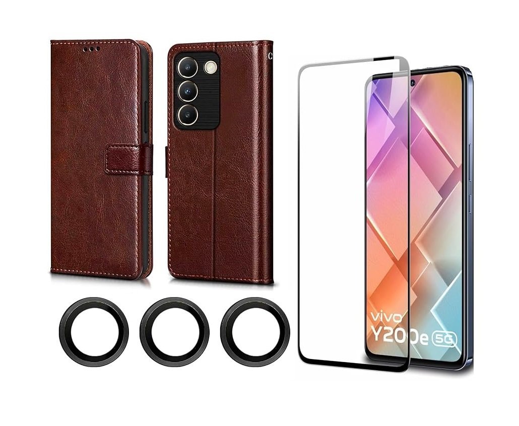 Here are the key features of the Leather Finish Shockproof Flip Cover (Brown) + Tempered Glass + Camera Lens Glass combo for the Vivo Y200e 5G / Vivo T3 5G: