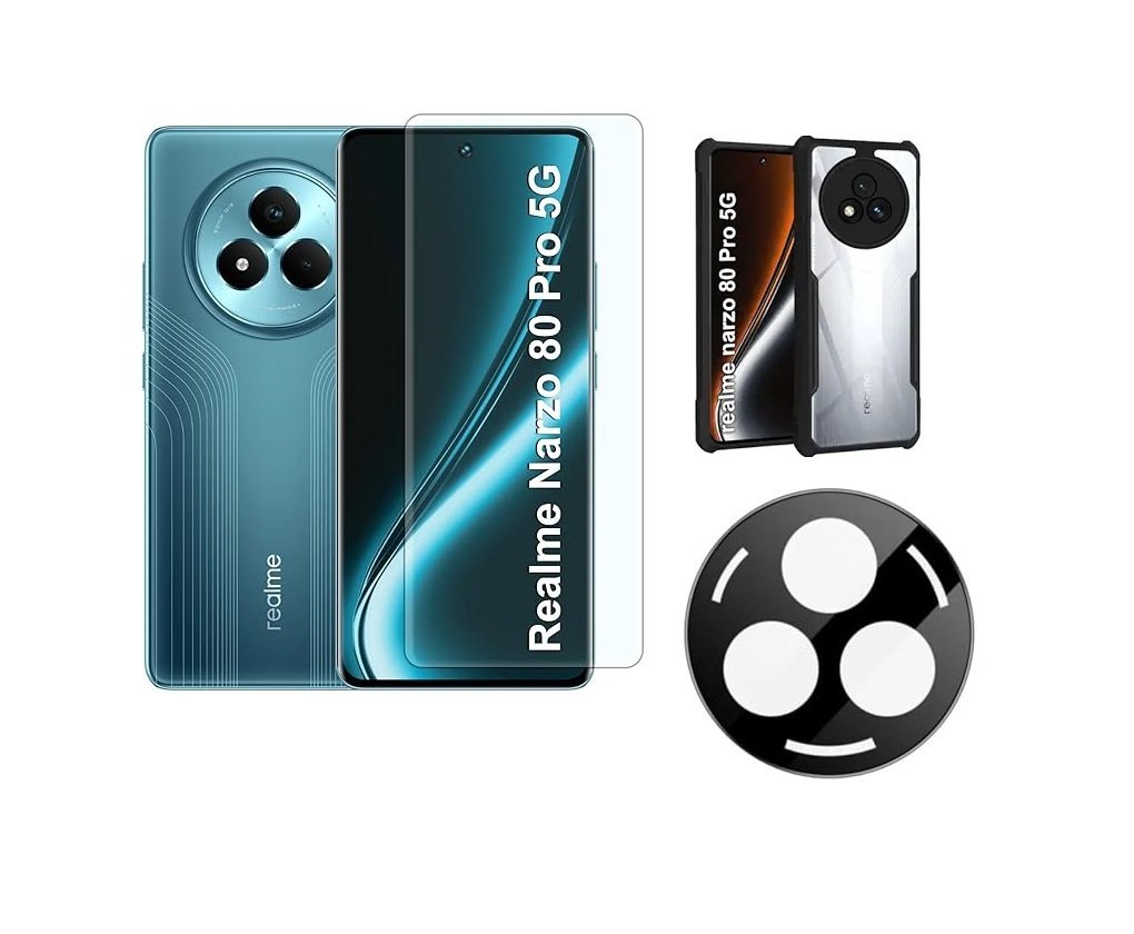 The 3-in-1 combo pack for the Realme Narzo 80 Pro 5G featuring the “Eagle Cover” Clear Back Cover, Tempered Glass, and Camera Lens Protector is designed to give your phone comprehensive, heavy-duty protection while keeping its design visible.