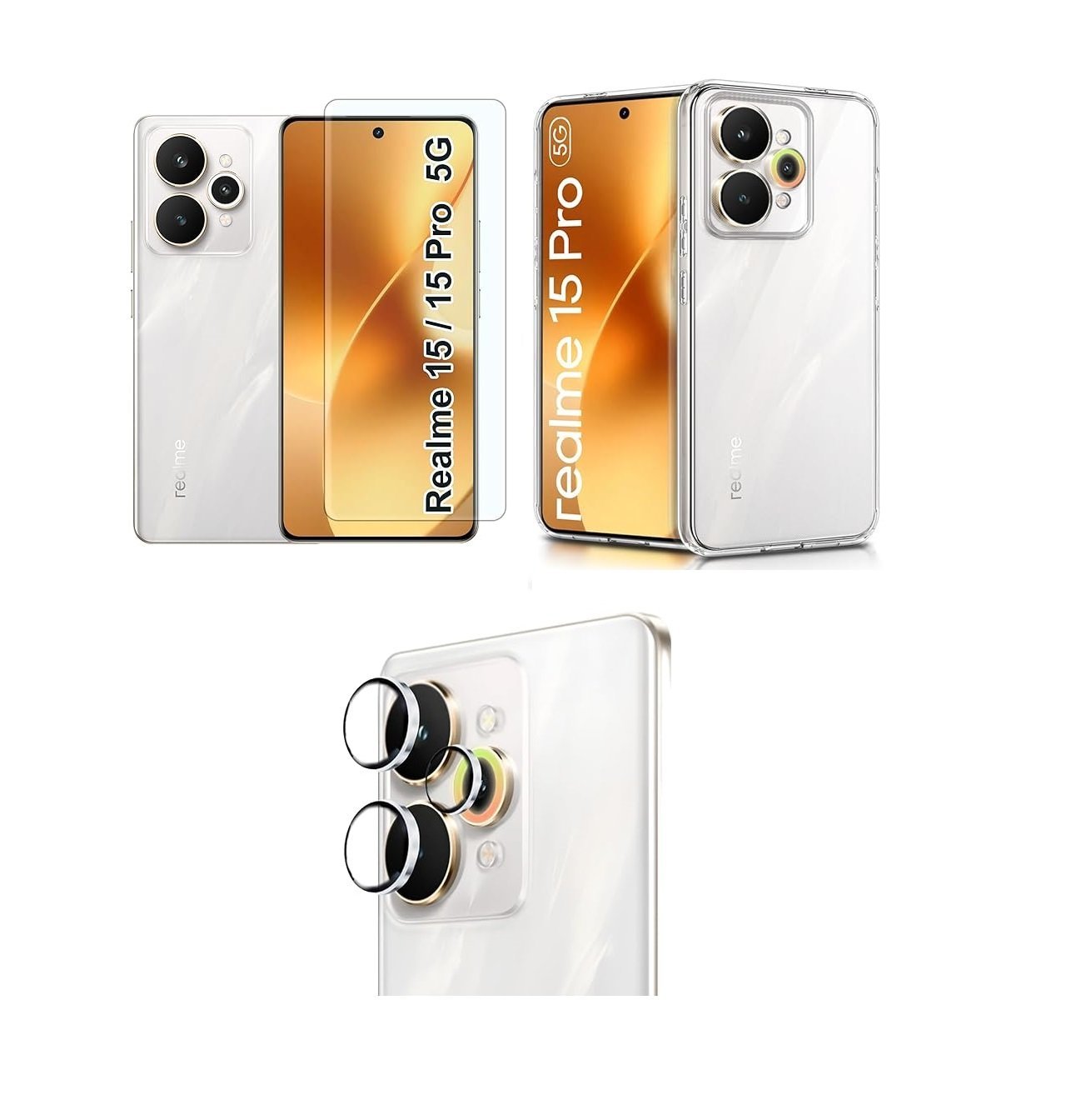 | Clear Back Cover | Showcase & Shock-Absorption | * Crystal Clear Transparency: Designed to be completely transparent to showcase the original color and design of your Realme 15 Pro 5G (e.g., Flowing Silver, Velvet Green, Silk Purple). |