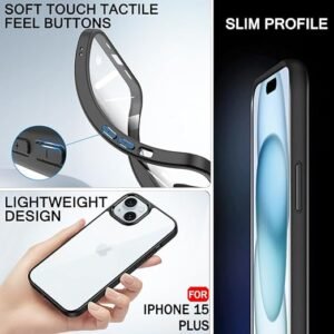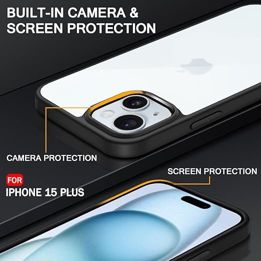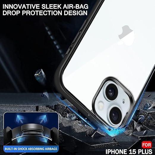The Ultra-Hybrid Shockproof Sleek Armor Back Cover Case for the iPhone 15 Plus with Black Sides is a high-performance hybrid case designed to offer maximum visibility of your phone’s design while providing heavy-duty, multi-layered protection.