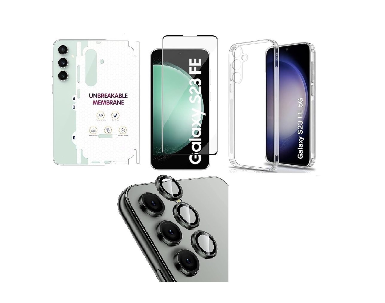4 in 1 Combo Pack for Samsung Galaxy S23 FE 5G – Transparent (Back Cover + Camera Lens Protector + Tempered Glass + Unbreakable Film)