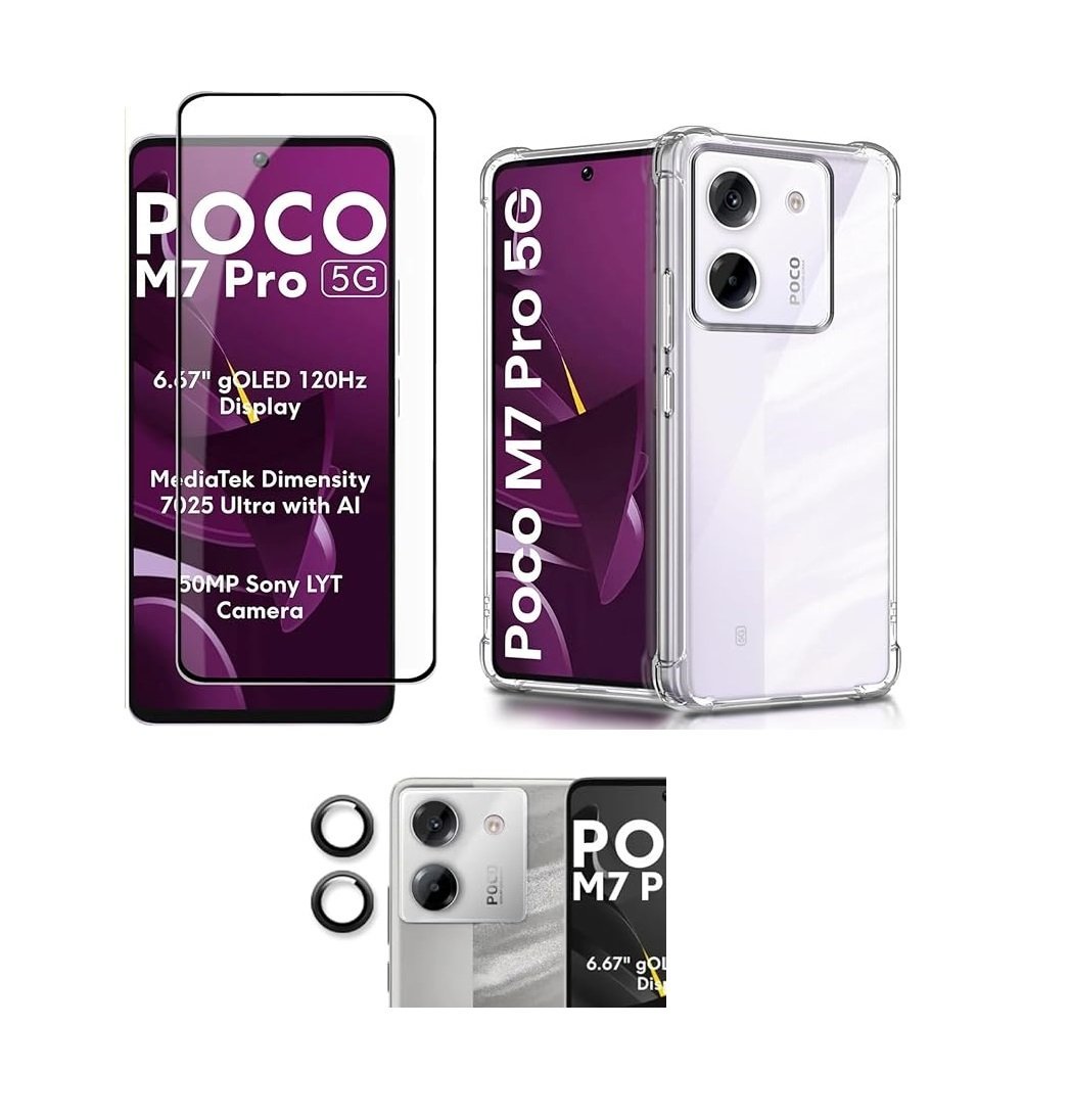 The 3-in-1 combo pack for the Poco M7 Pro 5G, which includes a Clear Back Cover, Tempered Glass screen protector, and Camera Lens Protector, is the ultimate package for complete, non-obtrusive protection. The goal is to safeguard the phone while fully showcasing its sleek design, which features a large 6.67-inch AMOLED display and a striking rear camera module.