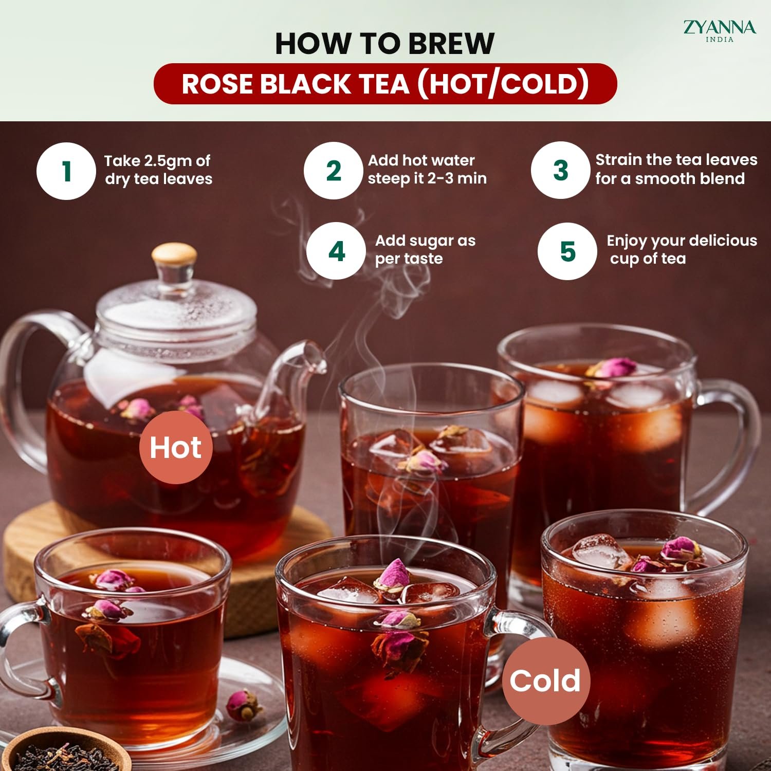 - PREMIUM BLACK TEA WITH REAL ROSE PETALS – A fragrant and elegant blend of bold black tea and delicate rose petals